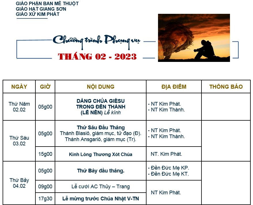 Phụng Vụ Thông Báo 03/04/2022 Giáo Xứ Kim phát Phụng Vụ GIÁO PHẬN BAN MÊ THUỘT BAN PHỤNG TỰ THÔNG BÁO V/v Xướng danh Đức Giám Quản trong Thánh lễ. Trọng kính: – Cha Tổng Đại Diện – Quý Cha Quản Hạt. […]