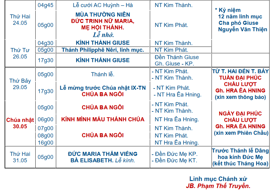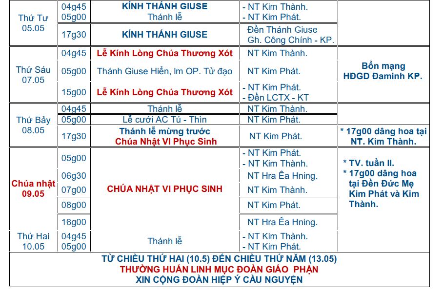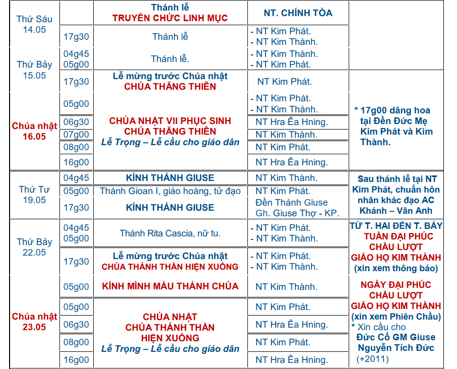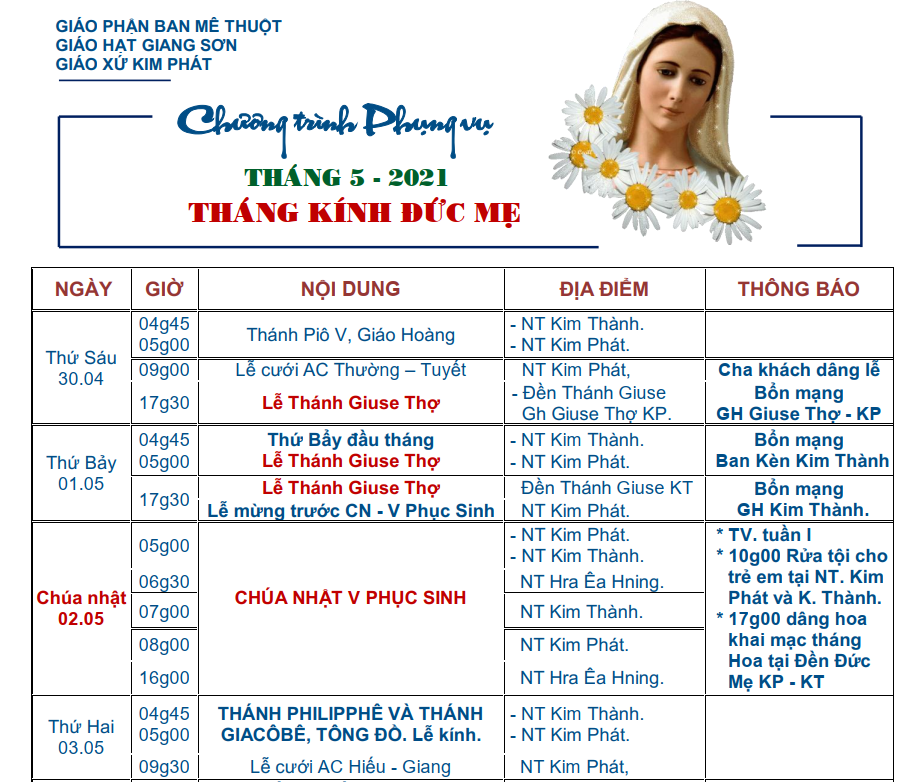 Lịch Phụng Vụ Tháng 5 – GX Kim Phát